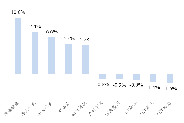 2、食品饮料板块中,调味发酵品(+4.4%)、预加工食品(+2.5%)、软饮料(+2.2%)表现相对靠前。均瑶健康、海天味业、千禾味业涨幅领先。